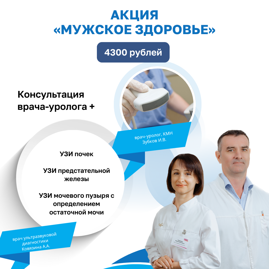 Забота о своем здоровье — важнейшая составляющая полноценной жизни! Специально для вас мы запускаем акцию «Мужское здоровье». В рамках акции каждый мужчина сможет пройти комплексную диагностику, включающую: